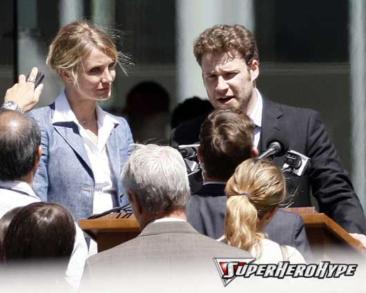 It only started filming a couple of days ago, but some wily website have already managed to nab the first pics from the set of The Green Hornet, which is currently filming in LA under the direction of Michel Gondry. The shots include our first look at Jay Chou wearing his Kato mask, as well as Cameron Diaz and Seth Rogen looking like, well, themselves.