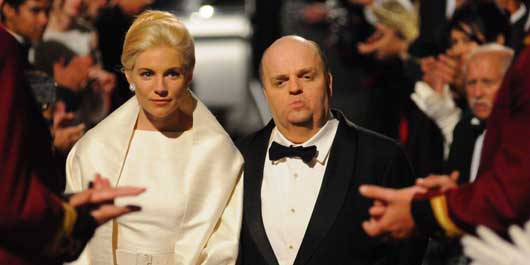 Poor old Toby Jones. Remember back in 2006 when his uncanny performance as Truman Capote in Infamous was overshadowed by Phillip Seymour Hoffman’s showier turn in Capote? Well, it seems it’s happened again. In the same year that Jones undergoes another utterly convincing transformation as Alfred Hitchcock for this HBO/BBC production, Anthony Hopkins is also donning a fat suit to play the twisted genius in Sacha Gervasi’s Hitchcock, which will reach a much larger audience in cinemas. Although neither actor is a physical match for Hitch (Timothy Spall must have been busy) they’ve both undergone extensive makeup sessions to give them the distinctive profile of the portly genius.